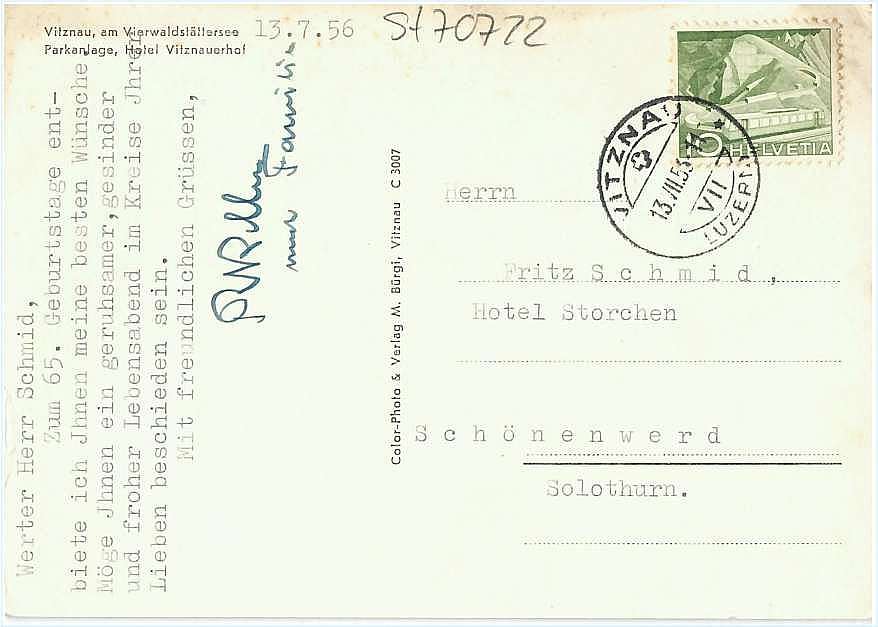 General Guisan war zwischen 1941 - 1945 immer mal wiedre Gast des Vitznauerhofs. Der damalige Direktor verehrte ihn schrieb ihm aber auch Reklamationsbriefe aufgrund der Sprengungen zum Bau der "Mühleflueh" Festung. Dies störte die Gäste